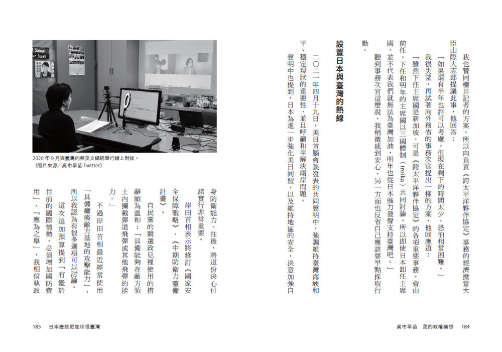 「臺灣擁有比日本先進的半導體奈米晶片等技術,並且是世界貿易組織、亞太經濟合作會議的成員。臺灣也以觀察員身分參與世界衛生組織,成功圍堵新冠疫情的卓越表現有目共睹,我們應該借鏡臺灣的經驗、向他們學習──日本將在國際上積極發聲,藉由倡導這些理念來支持臺灣。」